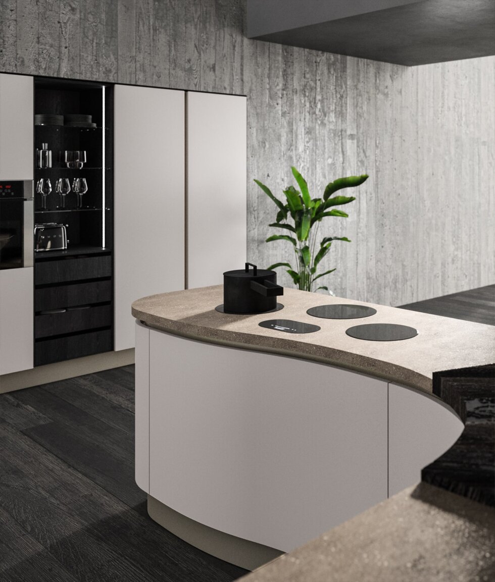 - Ρευστές Γραμμές: Η απαλότητα των σχημάτων δημιουργεί μια αίσθηση αρμονίας και οικειότητας, μετατρέποντας την κουζίνα σε έναν φιλόξενο χώρο.